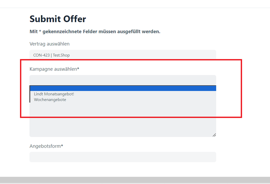 Übermitteln von Angeboten Bei Auswahl von „Offers“ wird die folgende Eingabemaske angezeigt. Mit * gekennzeichnete Felder sind Pflichtfelder.