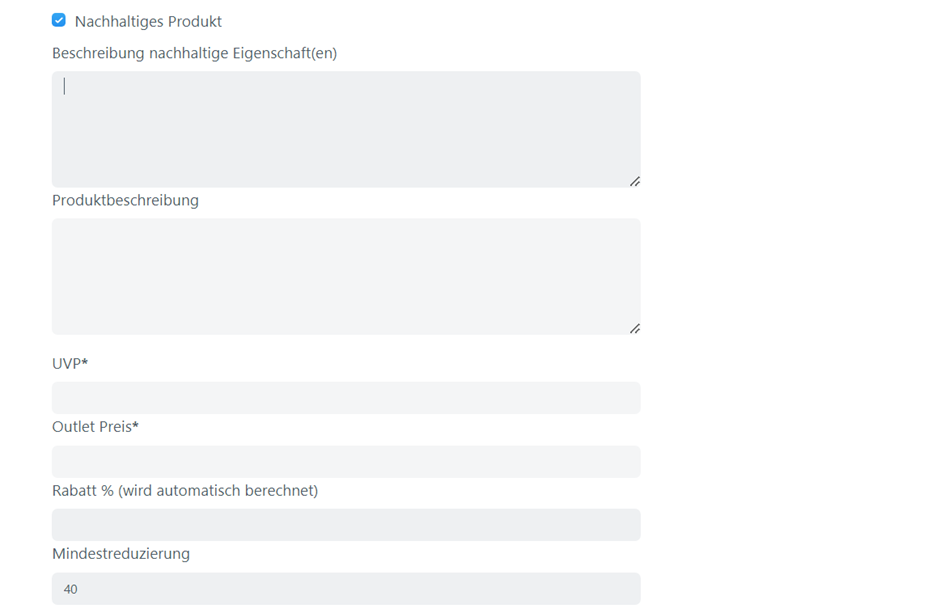 * Bei der Angebotsform Einzelartikel-Angebot sollen folgende Felder ausgefüllt werden. Falls es sich um ein nachhaltiges Produkt handelt, soll die Checkbox „Nachhaltiges Produkt“ angeklickt werden und das Feld „Beschreibung nachhaltige Eigenschaft(en)“ ausgefüllt werden. Der Rabatt wird beim Befüllen von „UVP“ und „Outlet Preis“ automatisch berechnet und darf die Mindestreduzierung nicht unterschreiten