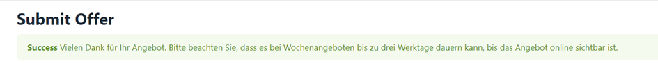 Nach erfolgreicher Angebot Abgabe erscheint folgendes Bild und Sie bekommen eine E-Mail mit dem Inhalt Ihres Angebotes.