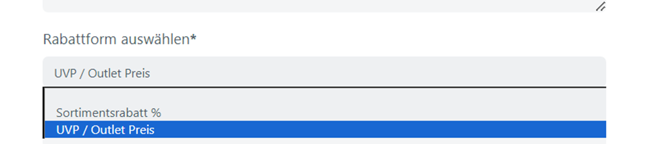 Bei der Wahl vom Sortimentsrabatt % geben sie den Sortimentrabatt in % ein und wählen die Art vom rabatierten Preis (UVP, Outlet Preis)