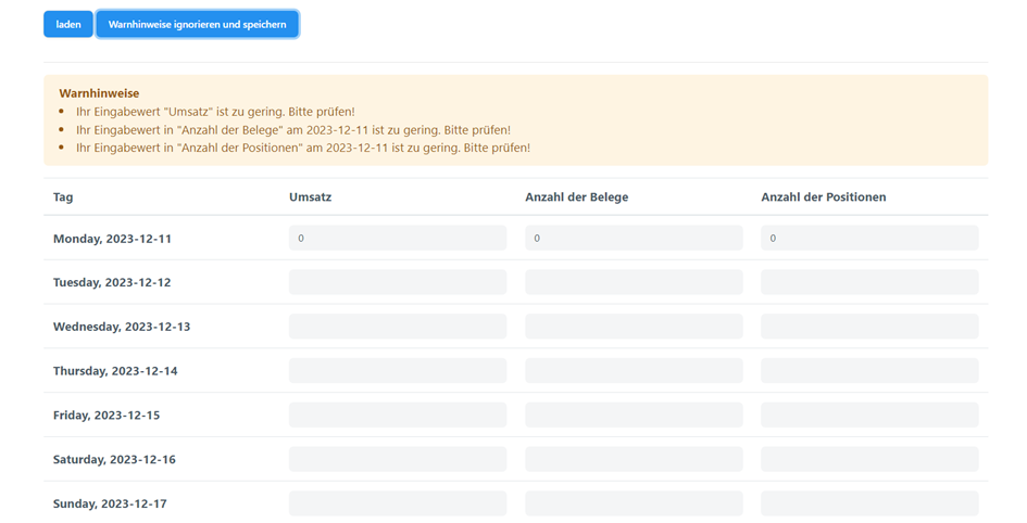 Um die Daten eingeben zu können drücken Sie auf die Schaltfläche „laden“. Unterhalb wird Ihnen eine Eingabe-Tabelle zur Verfügung gestellt. Hier müssen Sie Ihre Verkaufszahlen für die jeweiligen Tage eintragen.