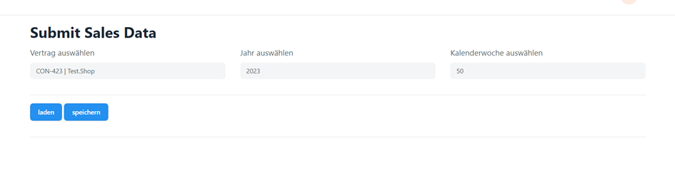 Menüpunkt 2 „Sales Data“ dient der Eingabe Ihrer Verkaufsdaten. Voreingestellt ist Ihr Vertrag, das aktuelle Jahr und die aktuelle Kalenderwoche. Falls Sie über mehrere Verträge verfügen, stehen alle Ihre Verträge zur Auswahl